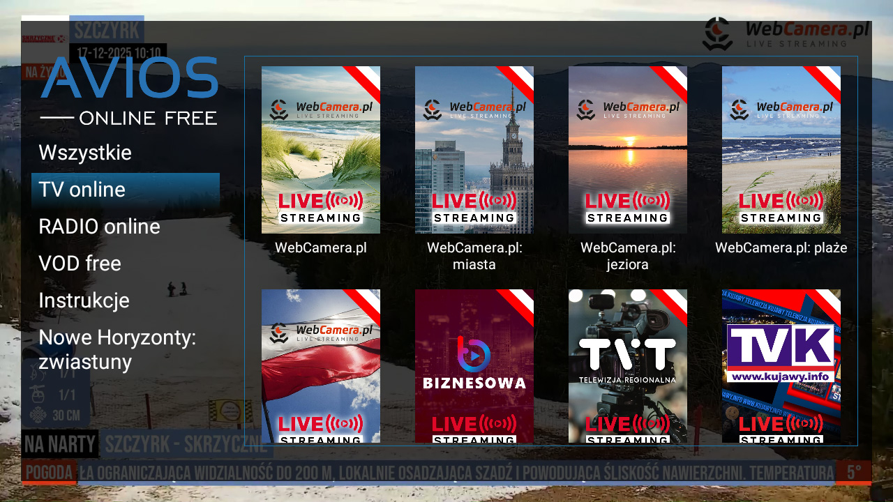 Tymczasem już od początku grudnia na kanale 30 usługi AVIOS działa specjalny stream „NA NARTY” od WebCamery. Prezentuje on szybki i aktualny przegląd warunków narciarskich z wybranych stacji w Polsce. W zaledwie kilkanaście minut widz może sprawdzić, gdzie warto wybrać się na narty lub snowboard.